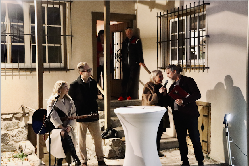 Musikalisch wurde die Enthüllung von einem Bläserquintett der Stadtmusik Schwaz begleitet und im Toni-Knapp-Haus gab es eine musikalische Umrahmung durch die Singer-Songwriterin Carina. Hier sprach Horst Unterlechner Jr. mit der Kulturreferentin Iris Mailer-Schrey über die Ausstellung und den Künstler Horst Unterlechner.